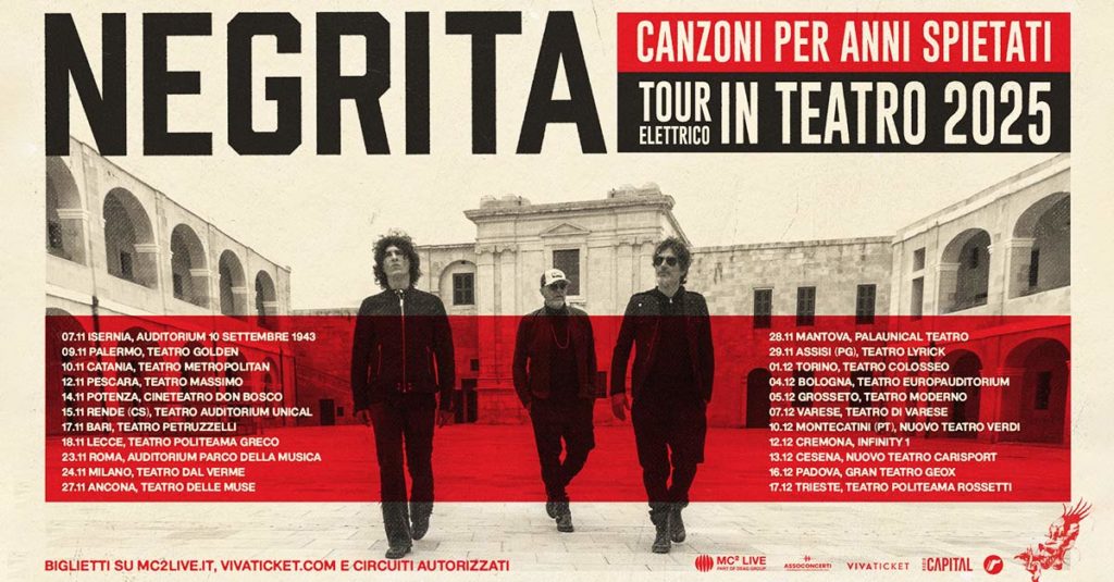 Il prossimo 7 novembre i NEGRITA torneranno in formazione completa in elettrico sui palchi dei principali teatri italiani con il loro “CANZONI PER ANNI SPIETATI TOUR IN TEATRO 2025”. Una nuova occasione per ascoltare dal vivo i brani dell’ultimo disco “CANZONI PER ANNI SPIETATI”, concept album uscito lo scorso marzo (a sette anni di distanza dal precedente lavoro in studio) che contiene i singoli “Non Esistono Innocenti Amico Mio”“Noi Siamo Gli Altri” e “Nel blu (Lettera ai Padroni della Terra)”, oltre alle canzoni che hanno segnato la storia della rock band italiana, brani che hanno superato indenni la prova del tempo rimanendo anche dopo 30 anni sempre attuali.